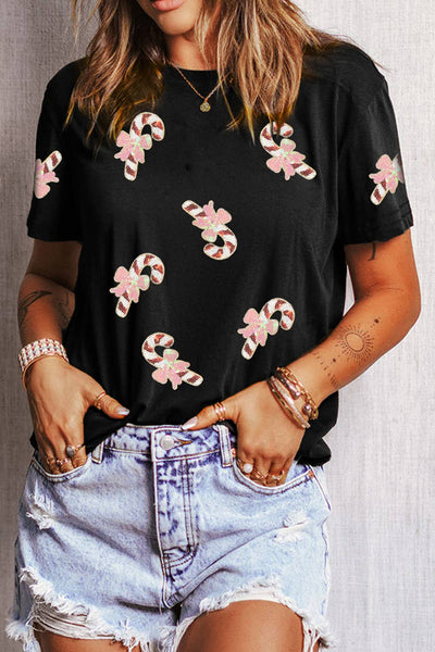 This festive black tee adds playful holiday charm with its allover candy-cane sequined patches and relaxed fit. Easy to style and incredibly comfortable, it’s the perfect casual Christmas top.