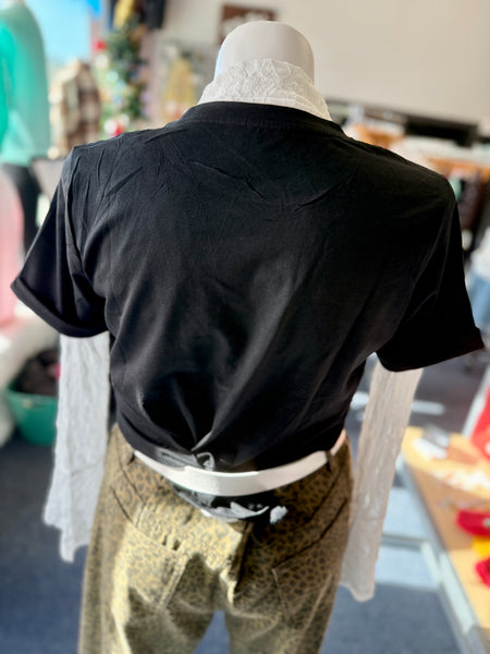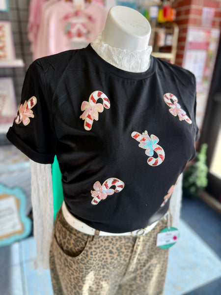 This festive black tee adds playful holiday charm with its allover candy-cane sequined patches and relaxed fit. Easy to style and incredibly comfortable, it’s the perfect casual Christmas top.