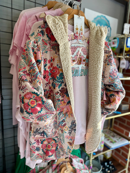 Cozy meets boho in this floral sherpa-lined jacket, featuring vibrant tapestry-style prints and an irresistibly soft interior. Perfect for adding warmth and personality to your everyday winter look.